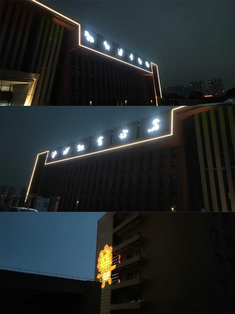 西安市兒童福利院亮化工程,主要是采用線條燈對樓體的頂部和側(cè)面輪廓進行勾勒,主樓安裝十二生肖發(fā)光造型,側(cè)墻采用圖案燈進行動畫投影,打出絢麗多彩的動畫卡通人物,與建筑的實用完整結(jié)合。