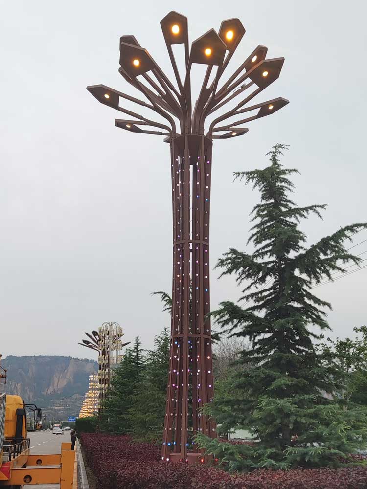 甘肅平?jīng)?米景觀燈項(xiàng)目,安裝位于崆峒山下的市政道路倆側(cè),主光源采用16個(gè)LED模組光源組成,配合燈體400的RGB點(diǎn)光源構(gòu)成,系統(tǒng)采用512控制,夜晚整體趁現(xiàn)炫彩效果,亮化倆側(cè)道路。